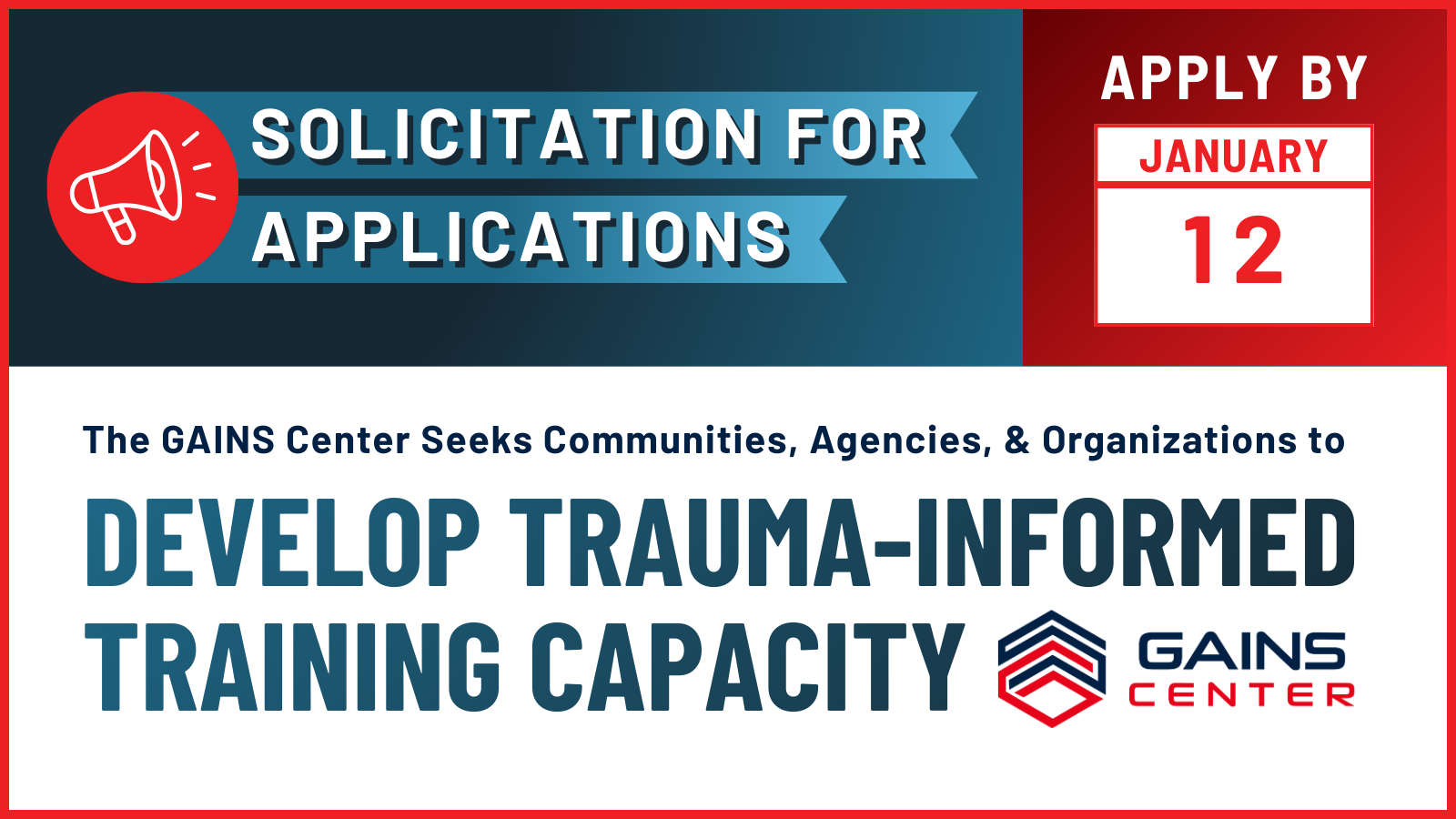 The GAINS Center for Behavioral Health and Justice Transformation, operated by Policy Research Associates, Inc. (PRA), known nationally for its work regarding people with behavioral health needs involved in the criminal justice system, is soliciting applications from communities, agencies, and organizations interested in developing a capacity to provide trauma-informed training. Apply for this opportunity to train a cadre of professionals in trauma-informed responses