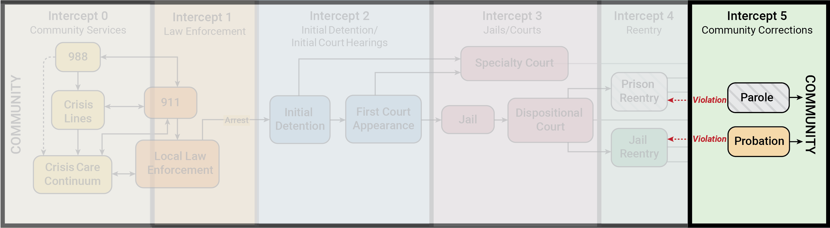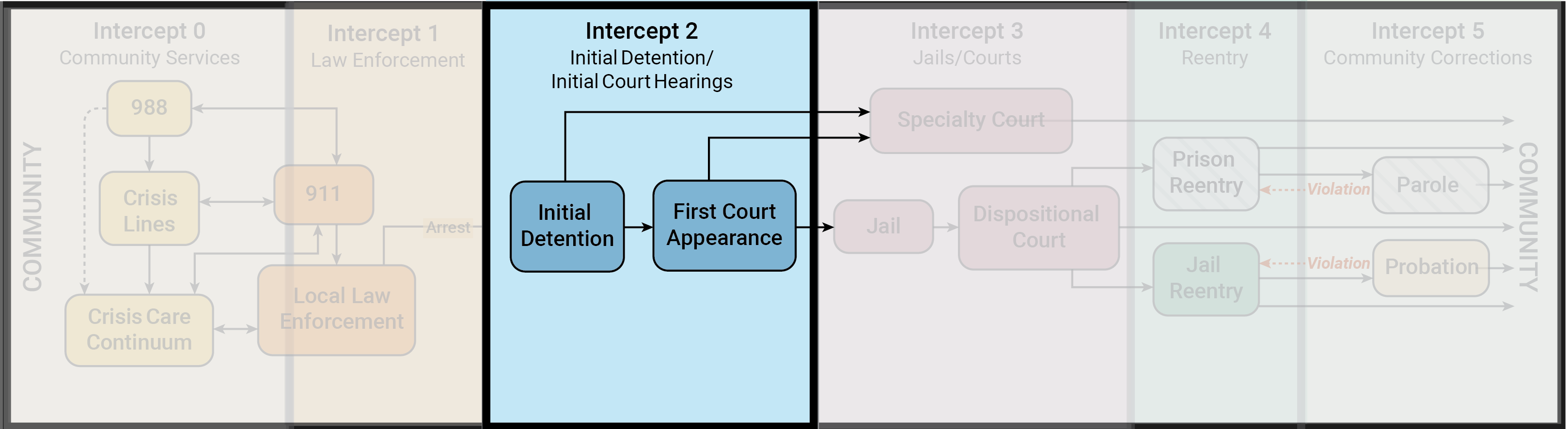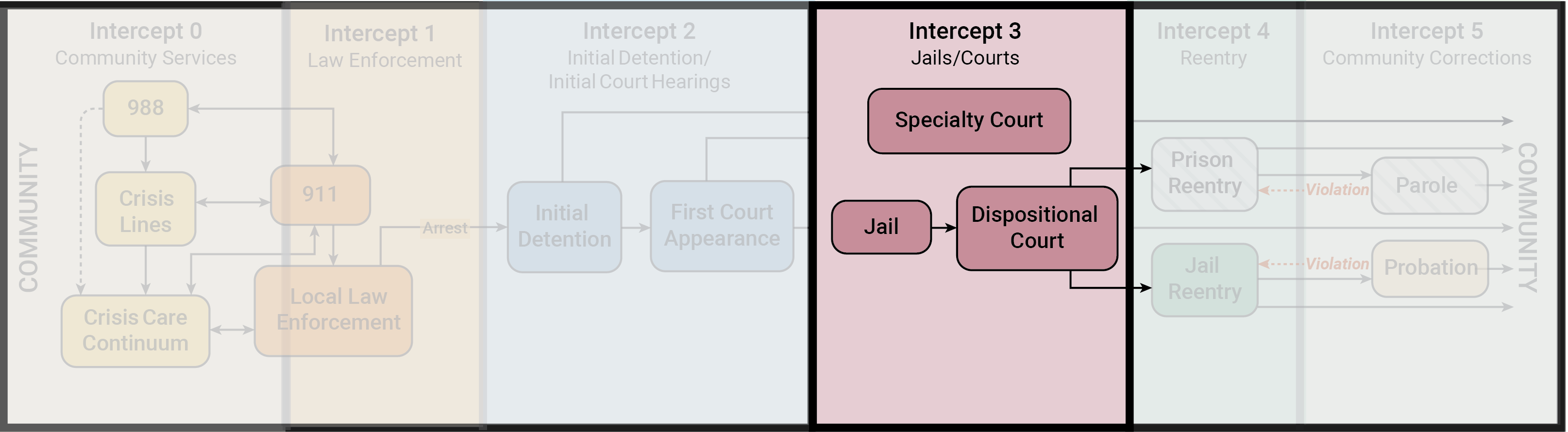 - Develop a comprehensive picture of how people with mental and substance use disorders flow through the criminal legal system along six distinct intercept points.