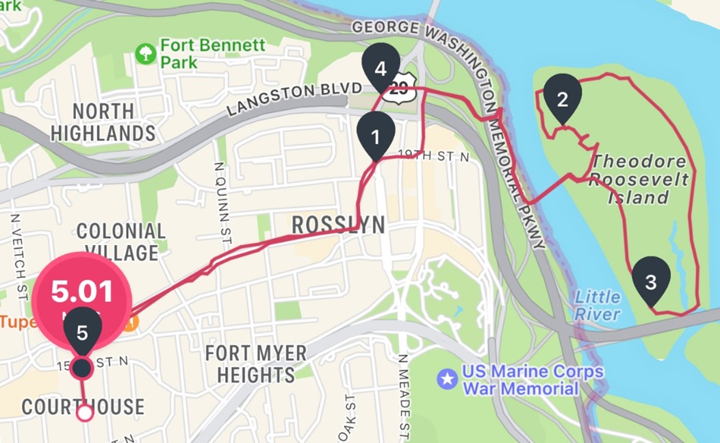 Being in Arlington for a couple of days and looking for a good route for a weekly run, I realized that this would be a great opportunity to take a trip down to the island that I’ve always wanted to visit. From the hotel, it was a mile and a half through the streets of Rosslyn, VA, to get down to the island. Urban running…sidewalks, crosswalks, keeping an eye out for cars and bikes. Mostly downhill, which made for a nice warmup and first-mile split, but as we know, what goes down must go up to get back to where you started!